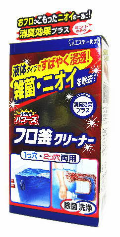 雑菌・ニオイを除去!エステー化学 ウルトラパワーズフロ釜クリーナー1つ穴・2つ穴両用価格: 378円レビュー評価: 0.0 レビュー数:0 名 称ウルトラパワーズ フロ釜クリーナー 1つ穴・2つ穴両用 内容量 350g 品 名 風呂釜用洗浄剤 成 分 抗菌剤、界面活性剤(ポリオキシエチレンアレキルエーテル)、キレート剤 液 性 弱アルカリ性 特 長 ●フロ釜や配管内部には、入浴によって体から出る汗やアカなどを含んだ有機物成分が、時間とともに付着します。それが湯ドロ・ヌメリとなり、雑菌の温床となっています。 ●液体タイプなのですばやく汚れに浸透して、フロ釜や配管内部に潜む湯ドロ、ヌメリを洗浄。 ●除菌効果で雑菌を除去し、清潔な状態にします●ミントの香りでイヤなニオイをスッキリ消臭。 ●強制循環釜(浴槽の穴が1つ |